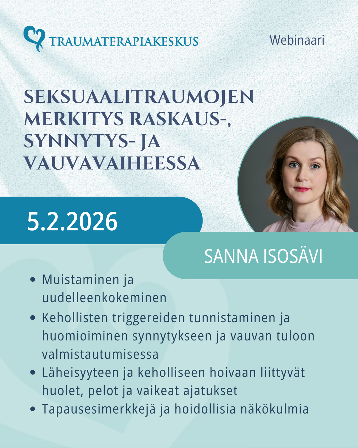 Kouluttaja: Sanna Isosävi, PsT, psykoterapeutti. Isosävi erikoisosaamisaluetta psykoterapeuttina, kouluttajana ja työnohjaajana on perinataaliteema ja erityisesti se, kuinka voimme huomioida usein juuri tässä ajanjaksossa aktivoituvia traumailmiöitä. Seksuaalitraumatisoituminen vaatii raskaana olevien, synnytykseen valmistautuvien ja vauvaperheiden kanssa työskenteleviltä ammattilaista erityistä huomiointia ja osaamista. Isosävi on kirjoittanut aiheesta mm. vuonna 2024 ilmestyneeseen 'Traumatisoituminen ja perhesuhteet' kirjaan.